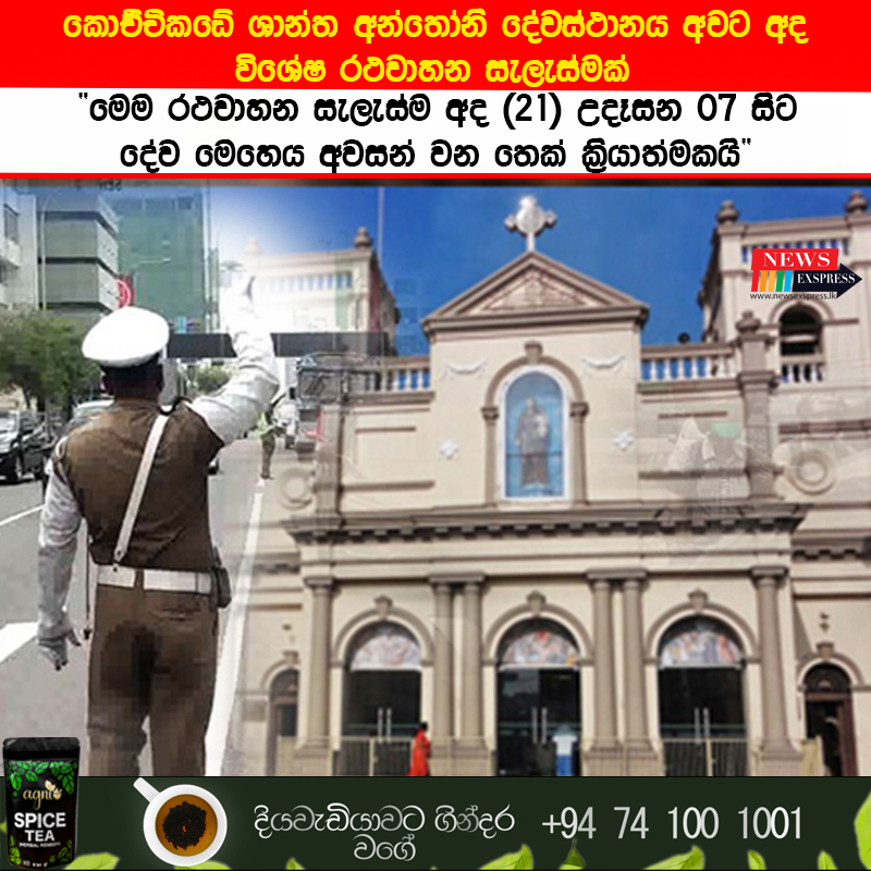 මෙම රථවාහන සැලැස්ම අද (21) උදෑසන 07:00 සිට දේව මෙහෙය අවසන් වන තෙක් ක්රියාත්මක වීමට නියමිත බවයි පොලිස් මූලස්ථානය නිවේදනයක් නිකුත් කරමින් සඳහන් කරන්නේ.