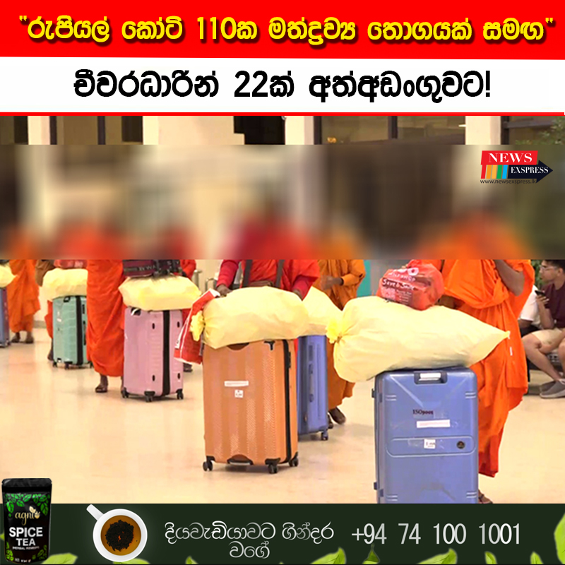 රුපියල් කෝටි 110කට අධික වටිනාකමකින් යුත් ” කුෂ්” සහ”හෑෂ් ”  මත්ද්‍රව්‍ය තොගයක් සමග චීවරධාරින්  22දෙනෙකු කටුනායක ගුවන්තොටුපොළේ දී අත්අඩංගුවට ගෙන තිබේ.
